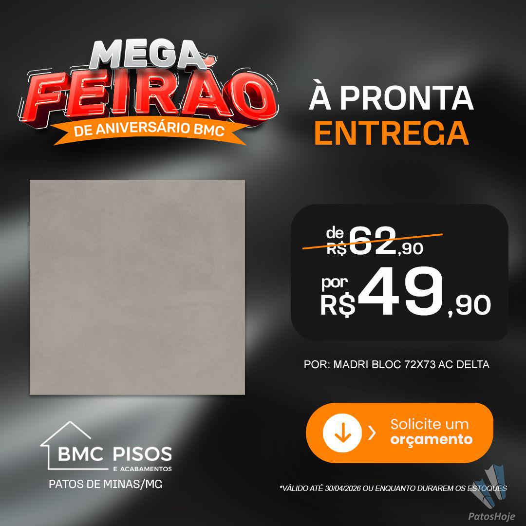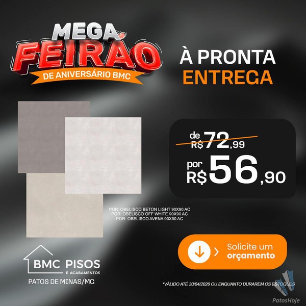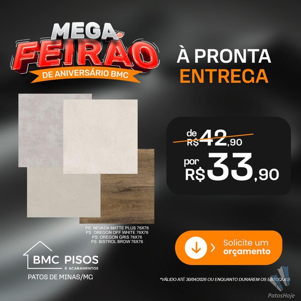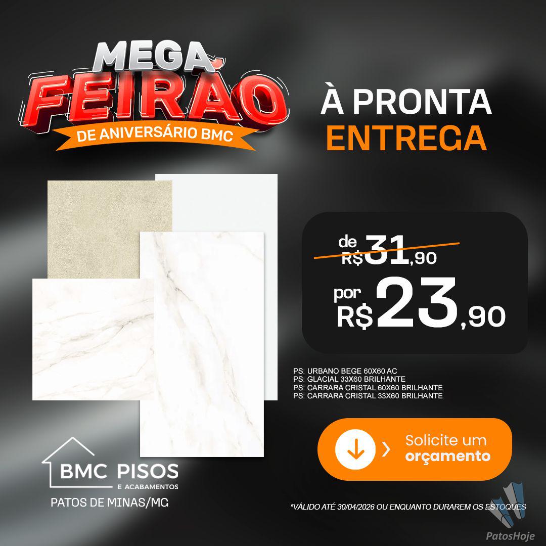 A BMC Pisos e Acabamentos está comemorando um ano em Patos de Minas com a realização do Mega Feirão de Aniversário, reunindo ofertas especiais e condições facilitadas de pagamento. As promoções já estão em vigor e seguem até o dia 20 de abril.