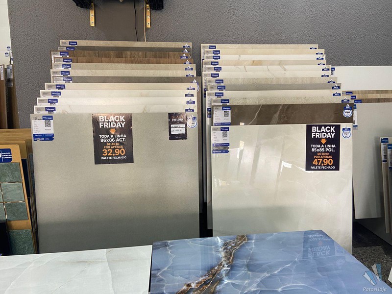 Logo na entrada da loja, dois expositores chamam a atenção de quem busca economia. No primeiro deles, há produtos gresalatos, com peças 100% resistentes à mancha d’água e retificadas, com preços a partir de R$ 20,90, além de diversos modelos já disponíveis para pronta entrega. Ao lado, vários tipos de porcelanato estão sendo oferecidos a partir de R$ 40,90, também com grande variedade em estoque.