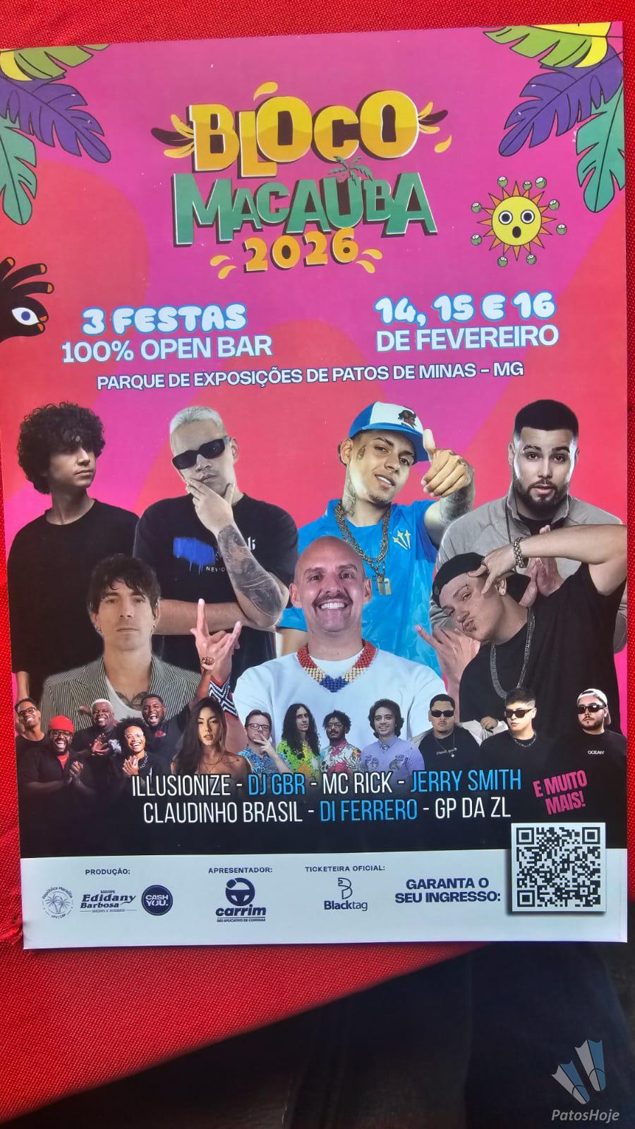 O Carnaval de Patos de Minas vai ferver com a 7ª edição do Bloco Macaúba, a 5ª realizada na cidade, consolidada como um dos maiores e mais esperados eventos do ano. São três festas, todas 100% Open Bar, cada uma com um tema diferente, reunindo grandes atrações nacionais e regionais em uma estrutura gigante no Parque de Exposições.