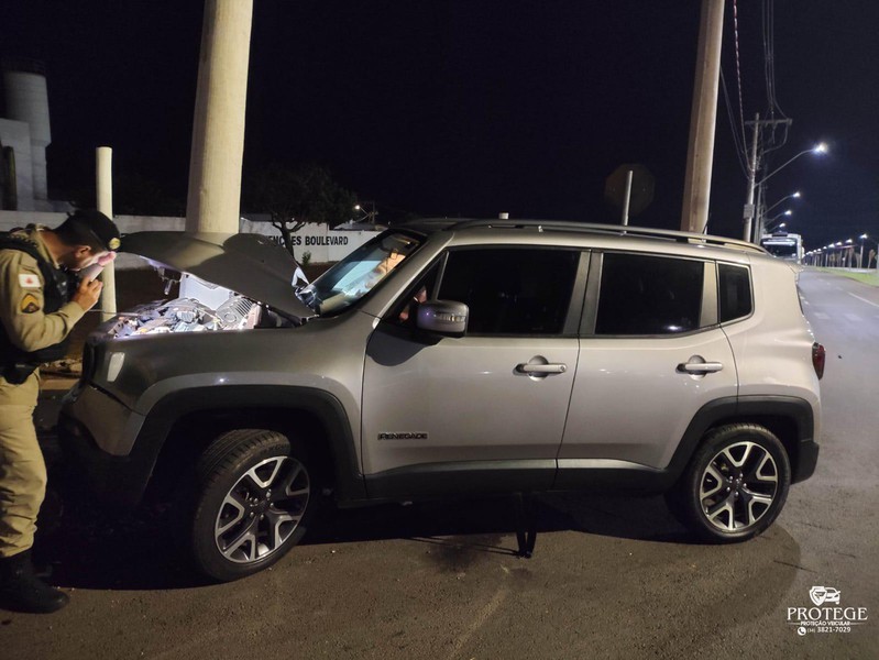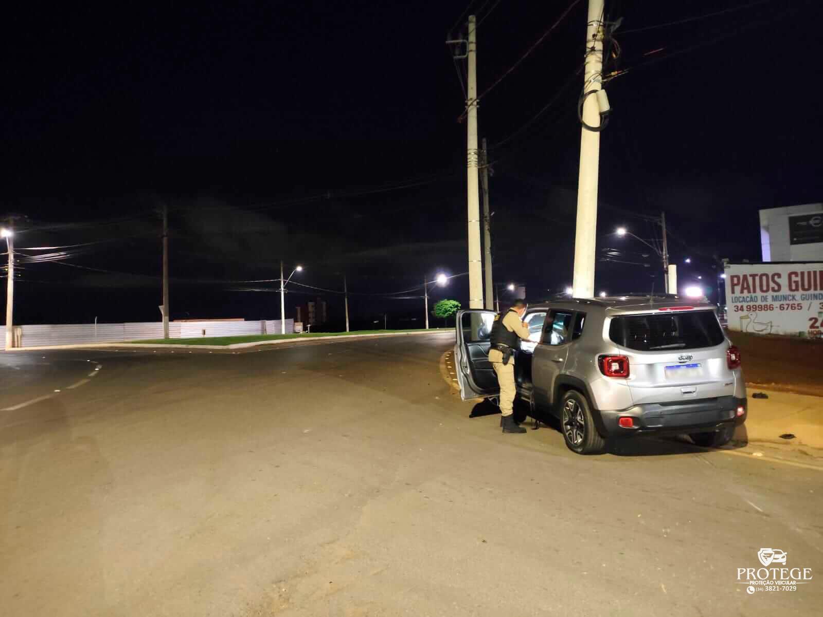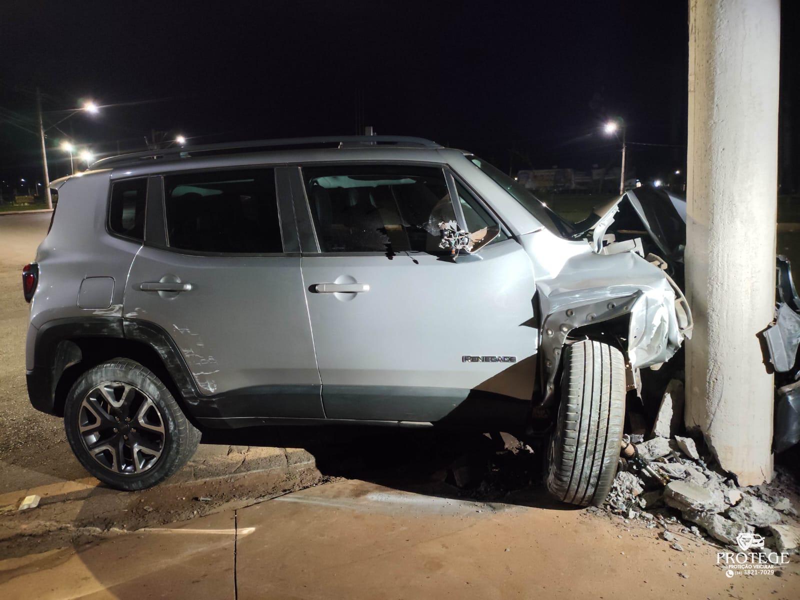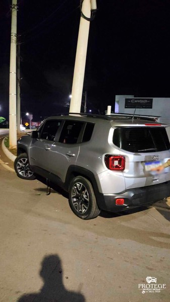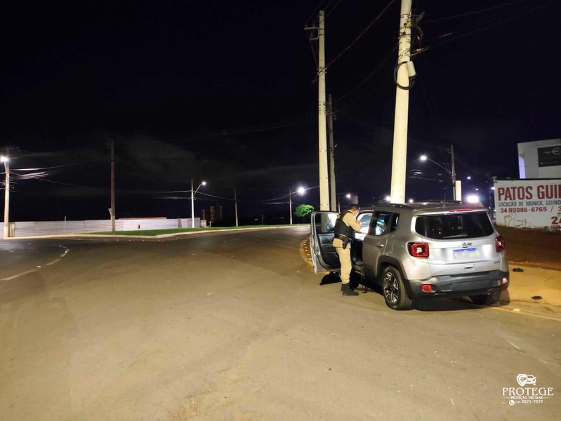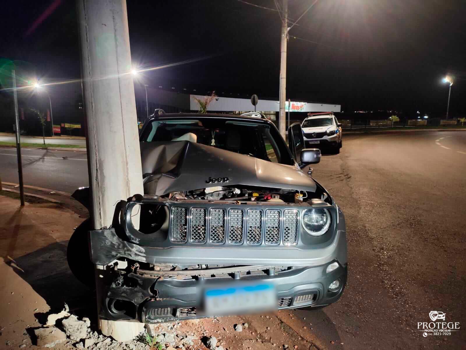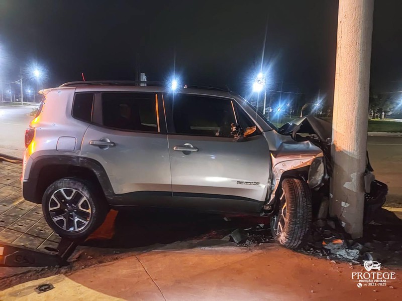 Os policiais encontraram o Jeep Renegade, de cor prata, com a frente danificada. O veículo seguia pela avenida Marabá, quando o condutor perdeu o controle direcional e bateu contra um poste de iluminação pública. Com o impacto, o poste ficou quebrado. A concessionária dos serviços de energia elétrica foi informada.