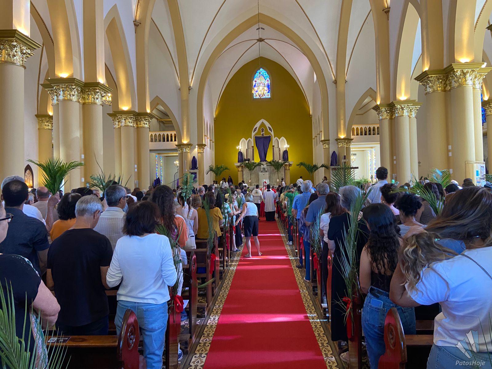 A comunidade católica celebra hoje (29) o Domingo de Ramos, data que marca o início da Semana Santa. Em Patos de Minas, centenas de fiéis participaram da celebração na Catedral de Santo Antônio, nesta manhã, que ficou completamente lotada. Os ramos serão incinerados e as cinzas serão utilizadas na próxima celebração de Quarta Feira de Cinzas.