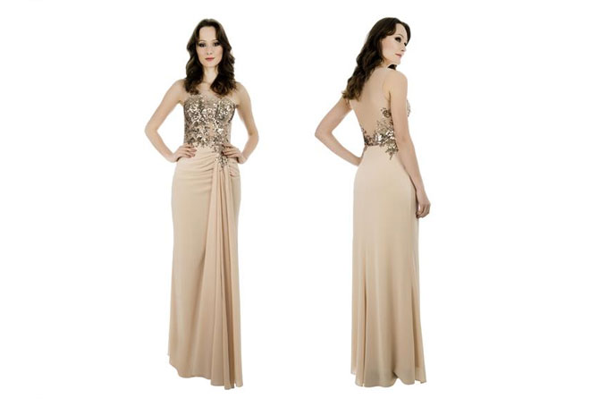 A cor nude continua em alta, nesse modelo a aplicação de paetes e o drapeado deram um ar mais glamouroso na peça, o drapeado também auxilia na marcação da silhueta.