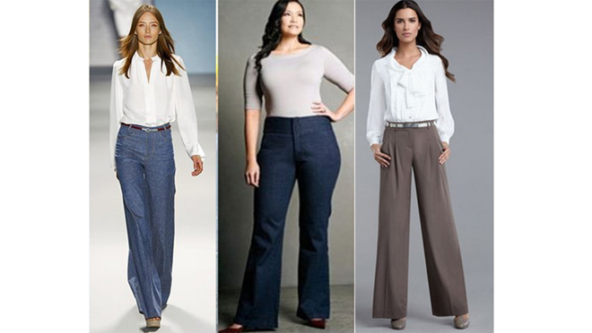 Uma boa dica é o uso das calças pantalonas, estão super em alta. Deixe a ponta dos pés aparecendo. A barra não deve arrastar no chão, além de deselegante não é muito higiênico. Para o dia a dia prefira as calças com pernas menos ousadas, deixe as calças com pernas muito amplas para shows e festas. Para mulheres com quadril avantajado aposte nos cortes retos, ajuda a manter a silhueta homogênea.