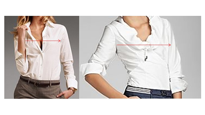 A linha em vermelho aponta a altura correta do decote. Ou seja, na primeira imagem a camisa deve ser abotoada para deixar o decote mais discreto.