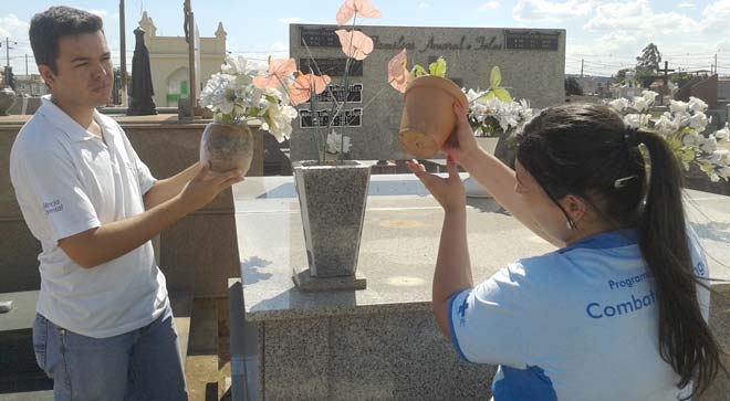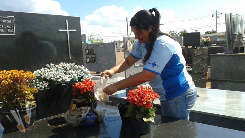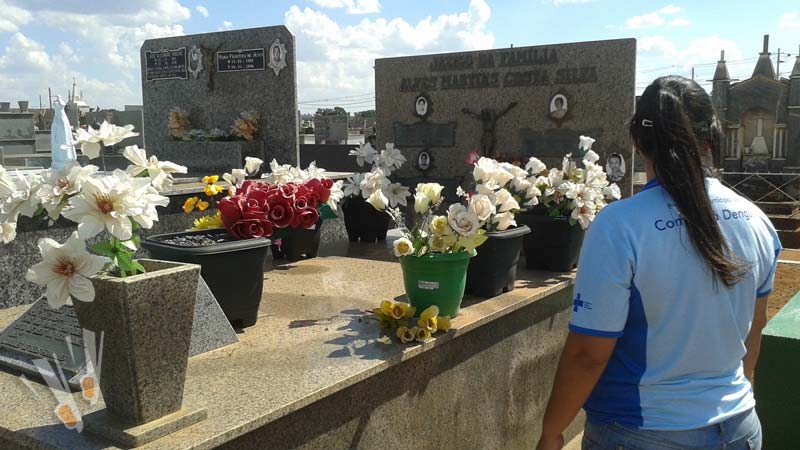Os visitadores sanitários também emitiram um alerta para as pessoas que vão visitar o Cemitério Municipal nesse domingo (02) Dia de Finados. A orientação é para que os vasos de planta estejam cheios de areia. Além disso, é importante que os vasos estejam furados para não acumular água. Outra recomendação é para evitar aqueles plásticos que são colocados em volta dos vasos de planta e que também podem acumular água.
