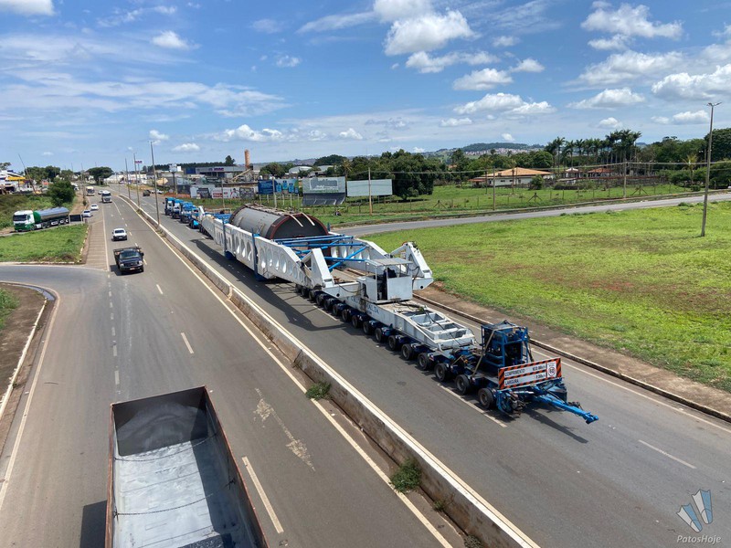 O comboio que transporta um sistema de moagem de quase 640 toneladas passou pelo Trevo da Pipoca, entroncamento da BR352 com a BR365, em Patos de Minas, na manhã desta terça-feira (02). A cena atraiu várias pessoas que acompanharam a manobra no viaduto. A carga está sendo transportada para a cidade de Edealina, município do Goiás.