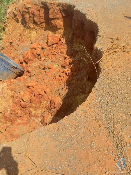 O problema foi verificado nessa segunda-feira (26). Os estragos estão no trecho entre o distrito de Alagoas e a BR 365, em Patos de Minas. Cones foram colocados no local para orientar os motoristas.
