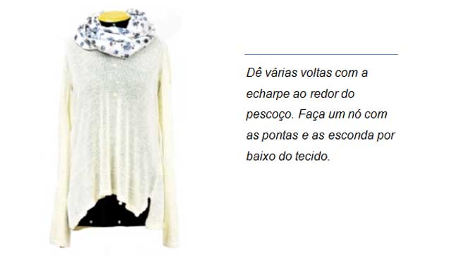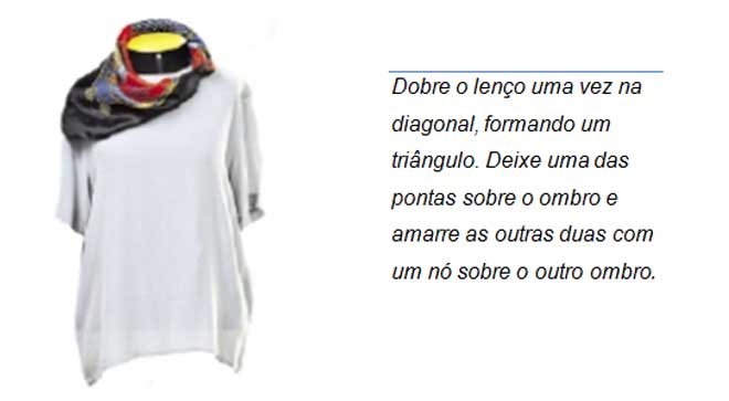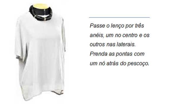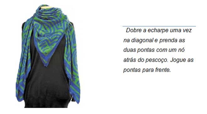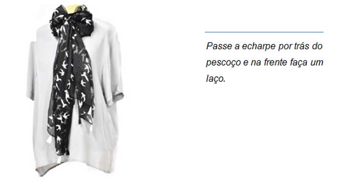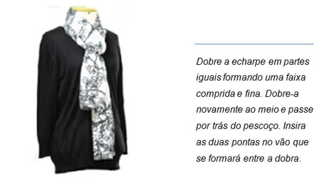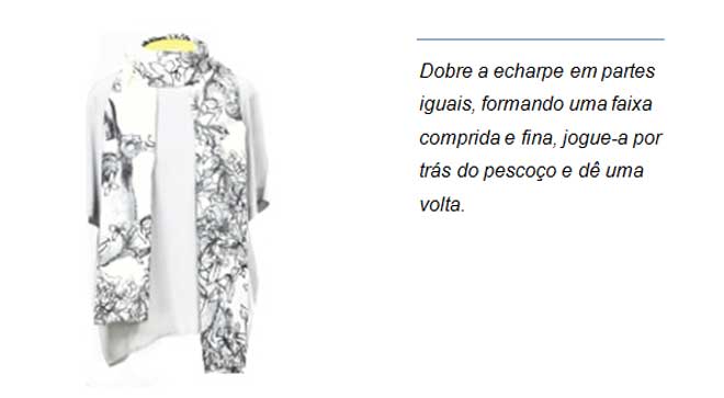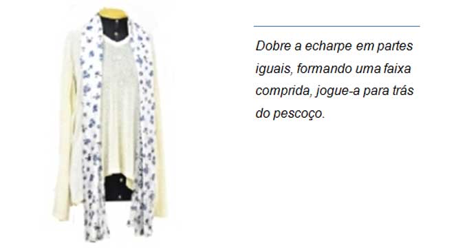 Echarpe: Faixa em tecido retangular larga e comprida, geralmente produzida em tecidos como: algodão, seda ou chifon.