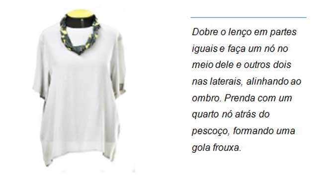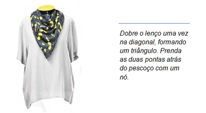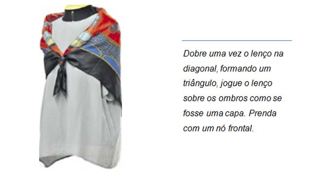 Lenço: Peças produzidas em formado quadrado ou triângulo de diversos tamanhos. Em tecidos de algodão, seda ou cetim.