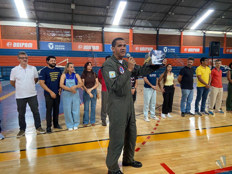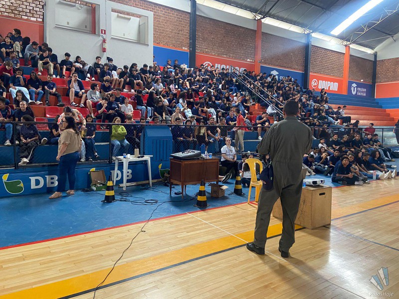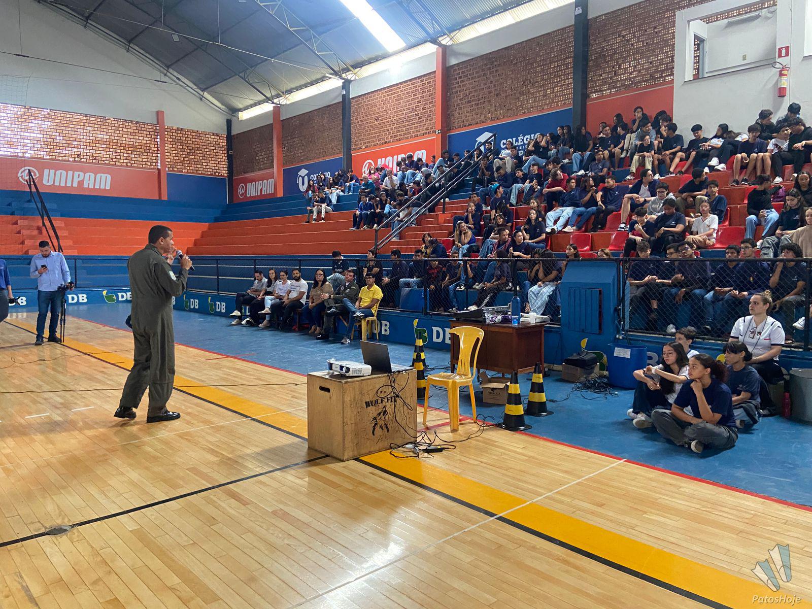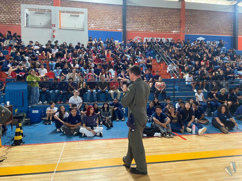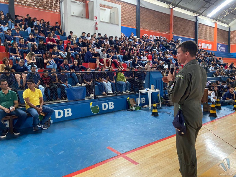Militares Esquadrilha da Fumaça, da Força Aérea Brasileira (FAB), realizaram, na manhã desta quinta-feira (26), uma palestra para alunos do 9° ano da rede municipal de ensino de Patos de Minas. O encontro aconteceu no Ginásio do PTC, no Centro da cidade. O objetivo foi mostrar para os alunos como é a atuação da FAB.