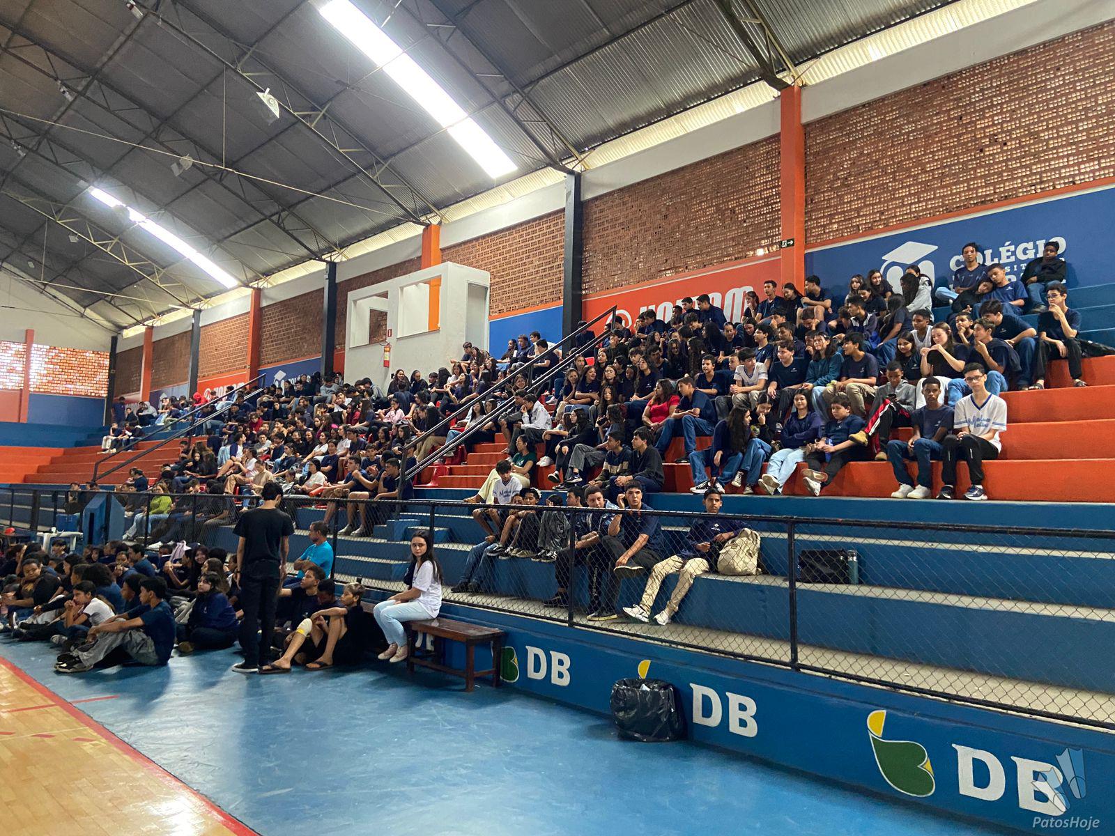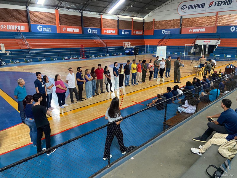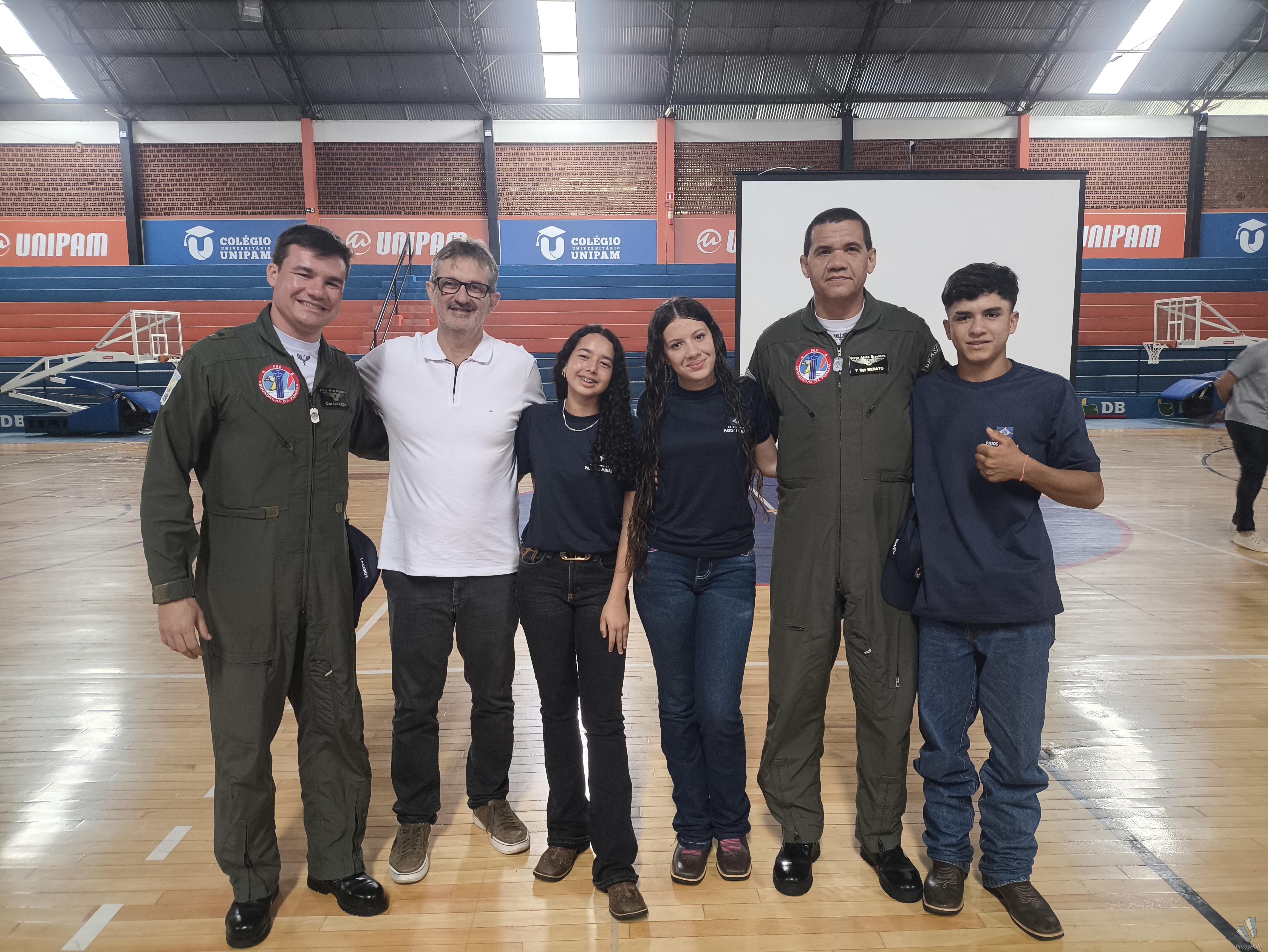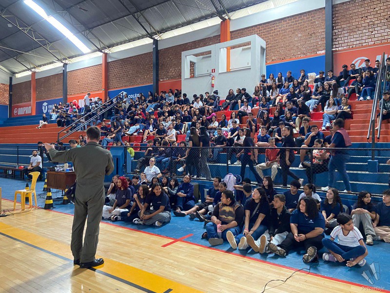 Militares Esquadrilha da Fumaça, da Força Aérea Brasileira (FAB), realizaram, na manhã desta quinta-feira (26), uma palestra para alunos do 9° ano da rede municipal de ensino de Patos de Minas. O encontro aconteceu no Ginásio do PTC, no Centro da cidade. O objetivo foi mostrar para os alunos como é a atuação da FAB.