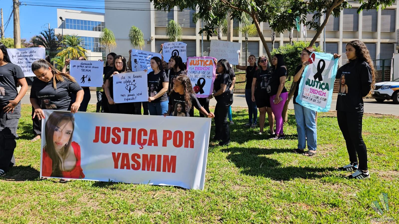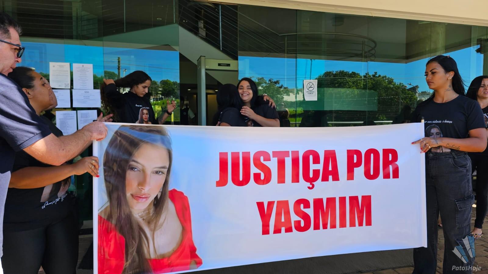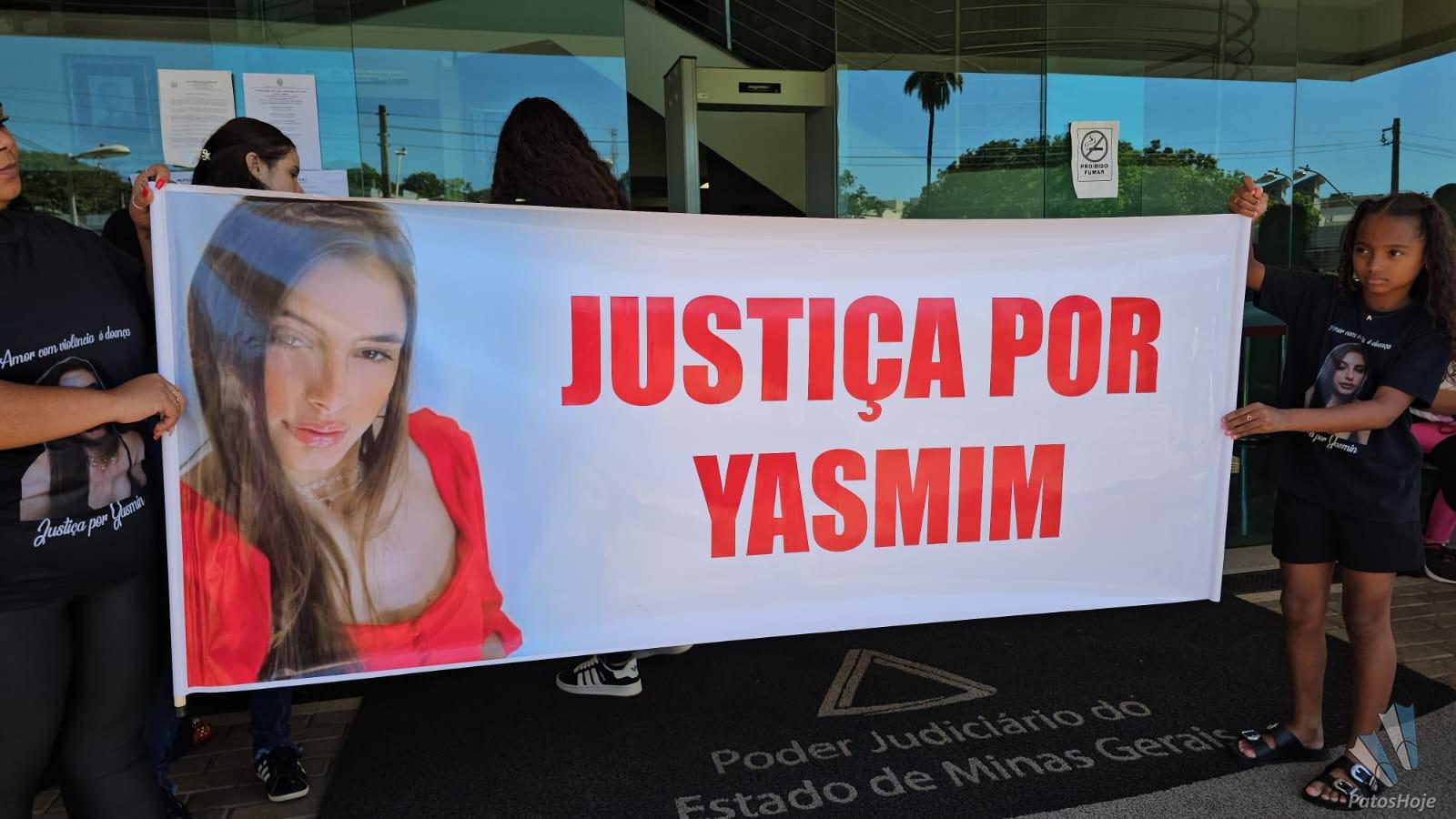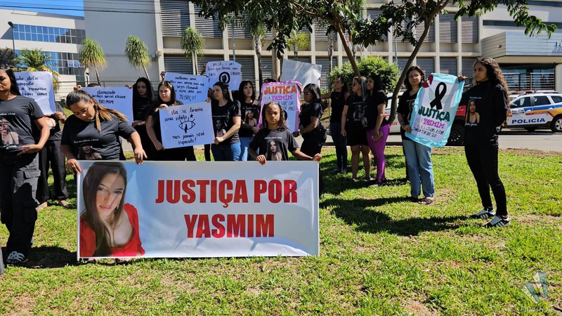 Familiares e amigos de Yasmin Araújo Castro e Silva, de 23 anos, realizam uma manifestação na porta do Fórum Olympio Borges, em Patos de Minas, na manhã desta quarta-feira (19). Com faixas, cartazes e camisetas personalizadas, eles pedem Justiça no julgamento de Mauro Vinícius Expedito Silva, de 25 anos, acusado de matar a jovem a tiros na frente da filha do casal. O réu será julgado hoje em júri popular.