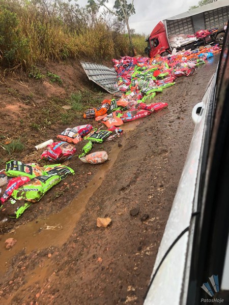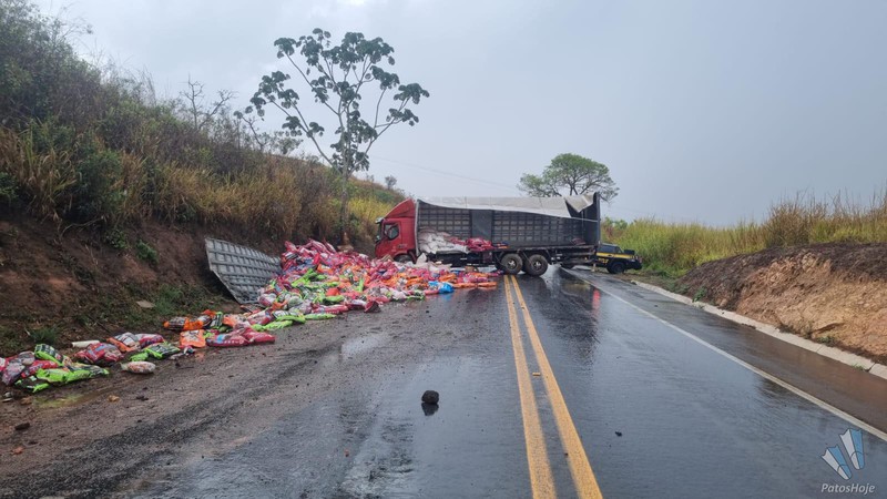 No km 407 da BR365, próximo a chamada curva da Serrinha, um caminhão que transportava ração de cães e gatos escorregou na pista e parou atravessado na rodovia. Parte da carga ficou espalhada pelo acostamento. Apesar do susto, o motorista saiu ileso.