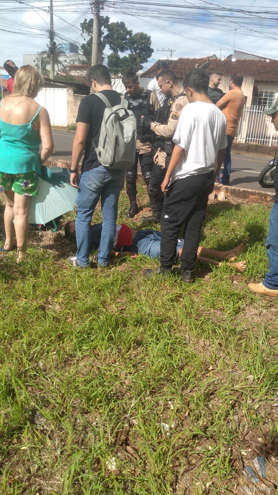 No local, os policiais encontraram os dois jovens caídos ao solo, em um terreno próximo à praça Zequito Rocha. A motocicleta estava caída com a placa levantada. Um caminhão também estava envolvido na batida.