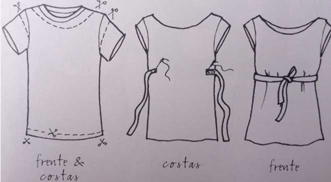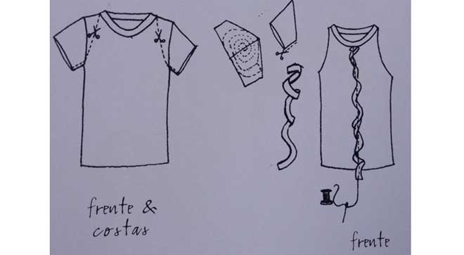 - Amarre as faixas, passando nas casas para fazer unir novamente frente e costas da camiseta.