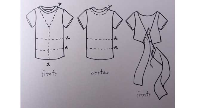 - Retrie uma faixa fazendo um recorte na parte inferior da camiseta frente e costas.