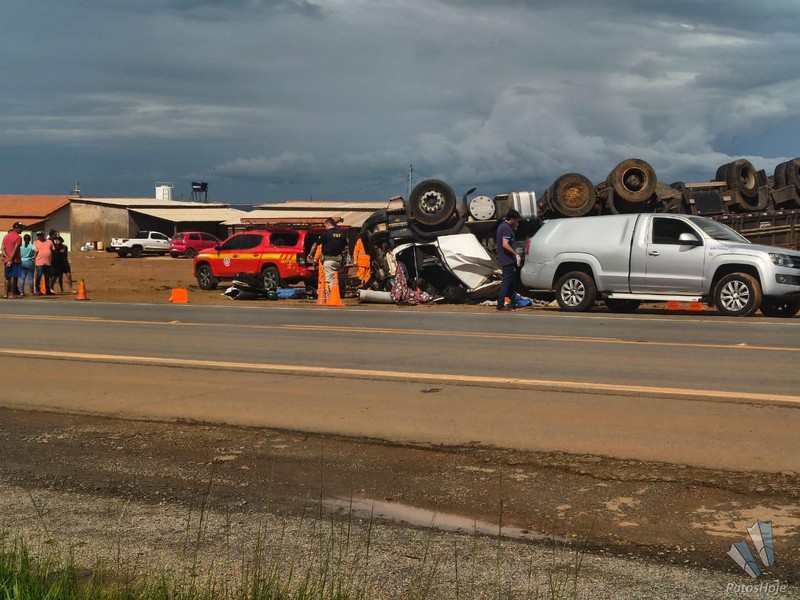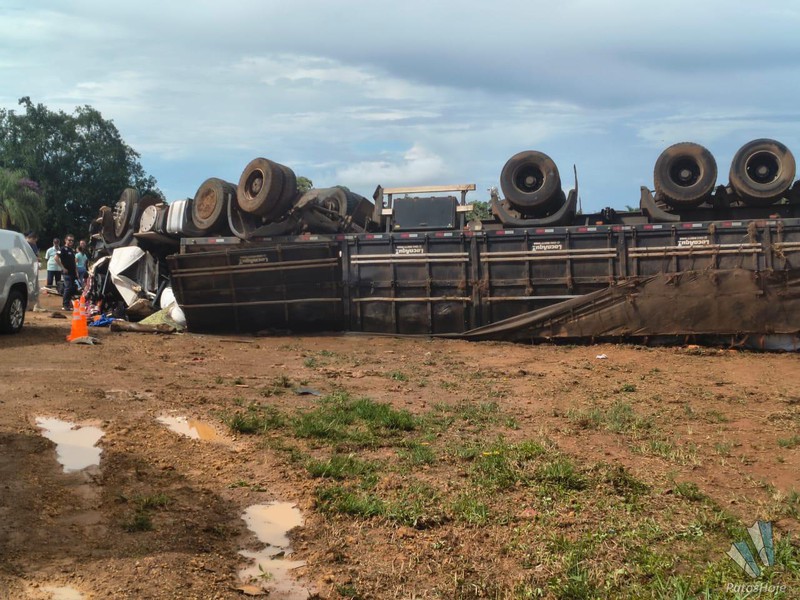 O condutor de uma carreta carregada com adubo morreu após o veículo capotar na BR365, próximo a comunidade rural Café Patense, em Patos de Minas. O acidente teria acontecido após um pneu estourar.