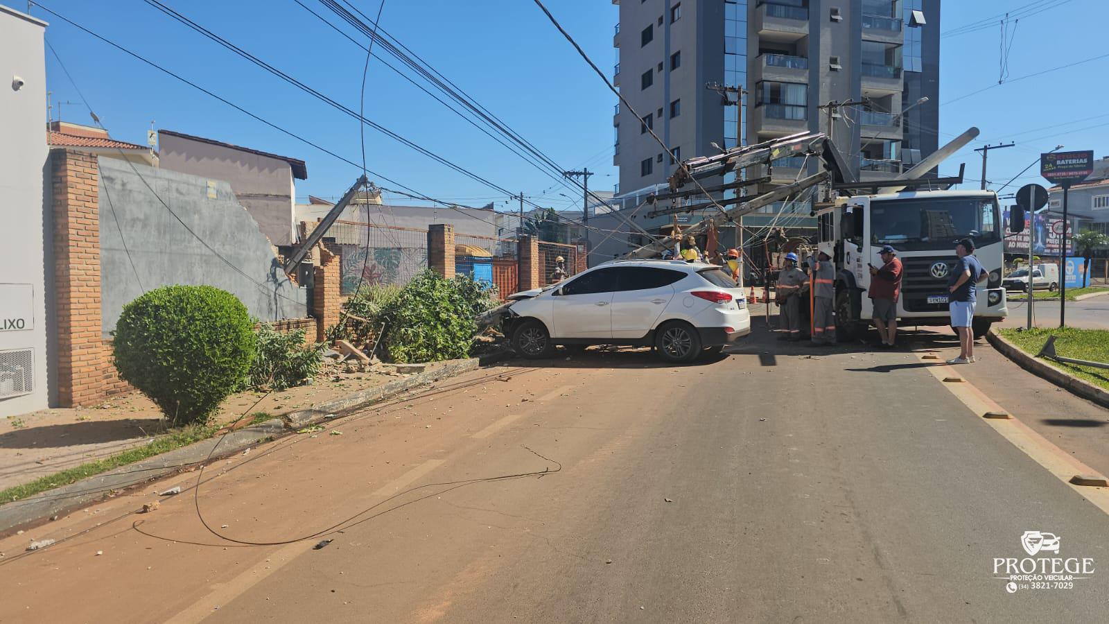 Segundo testemunhas, o motorista do carro perdeu o controle após um dos pneus estourar. Apesar dos estragos no poste e no veículo, ninguém se feriu.