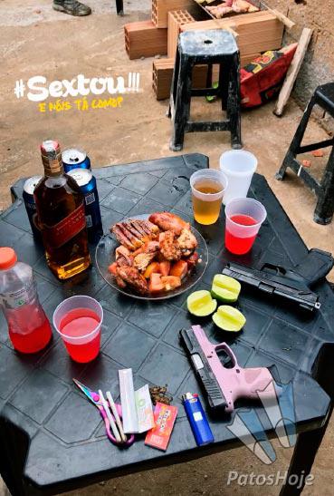 Além o material ilícito encontrado no local, a Polícia Militar também apreendeu os celulares com registros das postagens nas redes sociais. A foto que chamou a atenção dos policiais mostra uma mesa com bebidas, churrasco e as duas armas apreendidas.