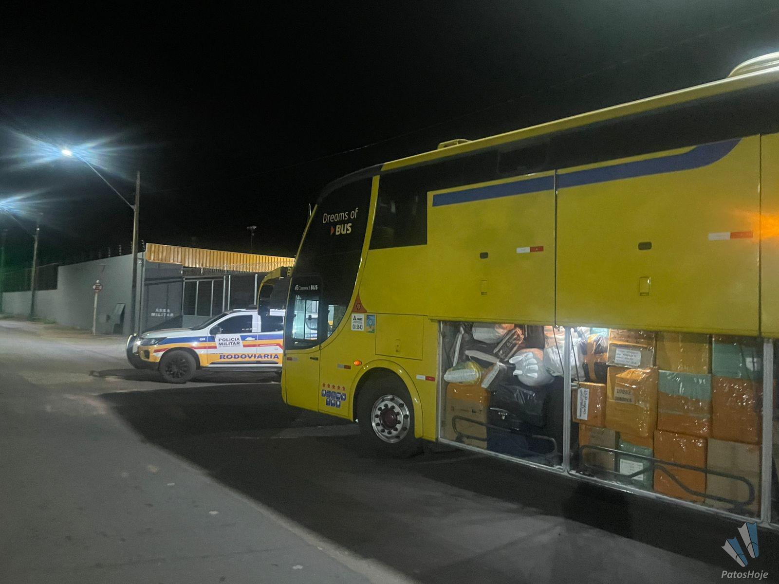 A Polícia Militar Rodoviária apreendeu grande quantidade de mercadorias de origem estrangeira transportadas de forma irregular em um ônibus, BR146, em Patos de Minas. A ação ocorreu no início da noite deste domingo (11), no km 01 da rodovia, e fez parte da operação “Última Parada”. Acessórios, óculos de sol e brinquedos sem certificação do INMETRO, além de cigarros eletrônicos, foram apreendidos.