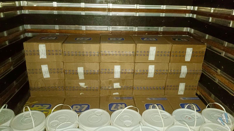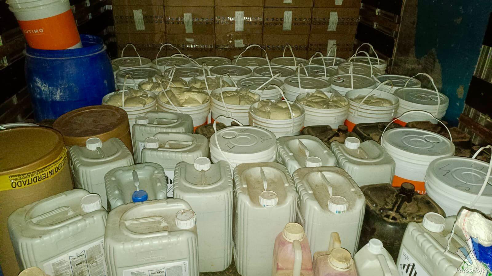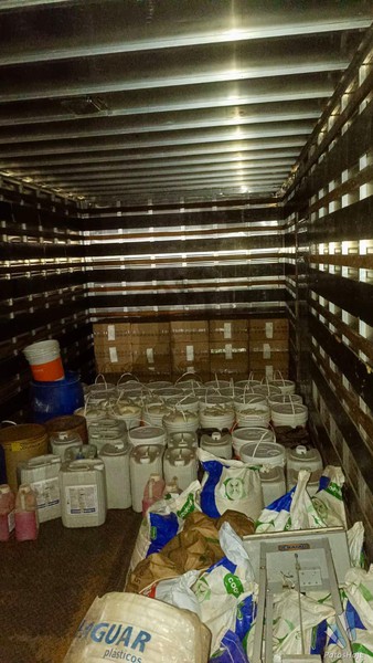 De posse das informações, as equipes policiais deslocaram-se até o endereço indicado e constataram que o portão de uma residência ainda em construção encontrava-se aberto. Do lado de dentro, os militares flagraram dois indivíduos, de 16 e 43 anos, utilizando equipamentos de proteção individual enquanto manipulavam, pesavam e selavam produtos agropecuários, em uma estrutura improvisada semelhante a um laboratório. No local, havia diversas embalagens espalhadas e maquinário utilizado para o fracionamento e acondicionamento do material.