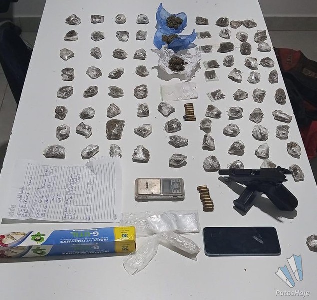 Na segunda ocorrência, no centro da cidade, a PM abordou autores dentro de um imóvel, onde foi encontrado vasto material relacionado ao tráfico, além de uma pistola, munições calibres .38 e .32 e anotações.