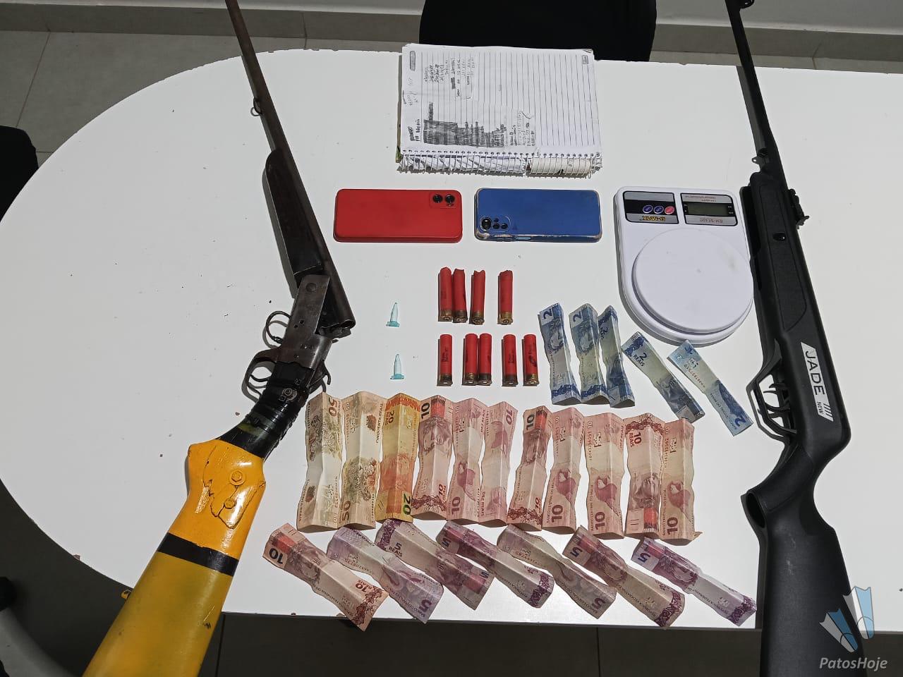 Na primeira ação, no bairro Cátiara, os militares flagraram movimentação típica de tráfico. Durante a tentativa de abordagem, os suspeitos fugiram, abandonando drogas e uma balança de precisão. Em buscas na residência, foram apreendidas duas espingardas, munições, dinheiro e anotações. O autor foi localizado posteriormente e preso em flagrante.