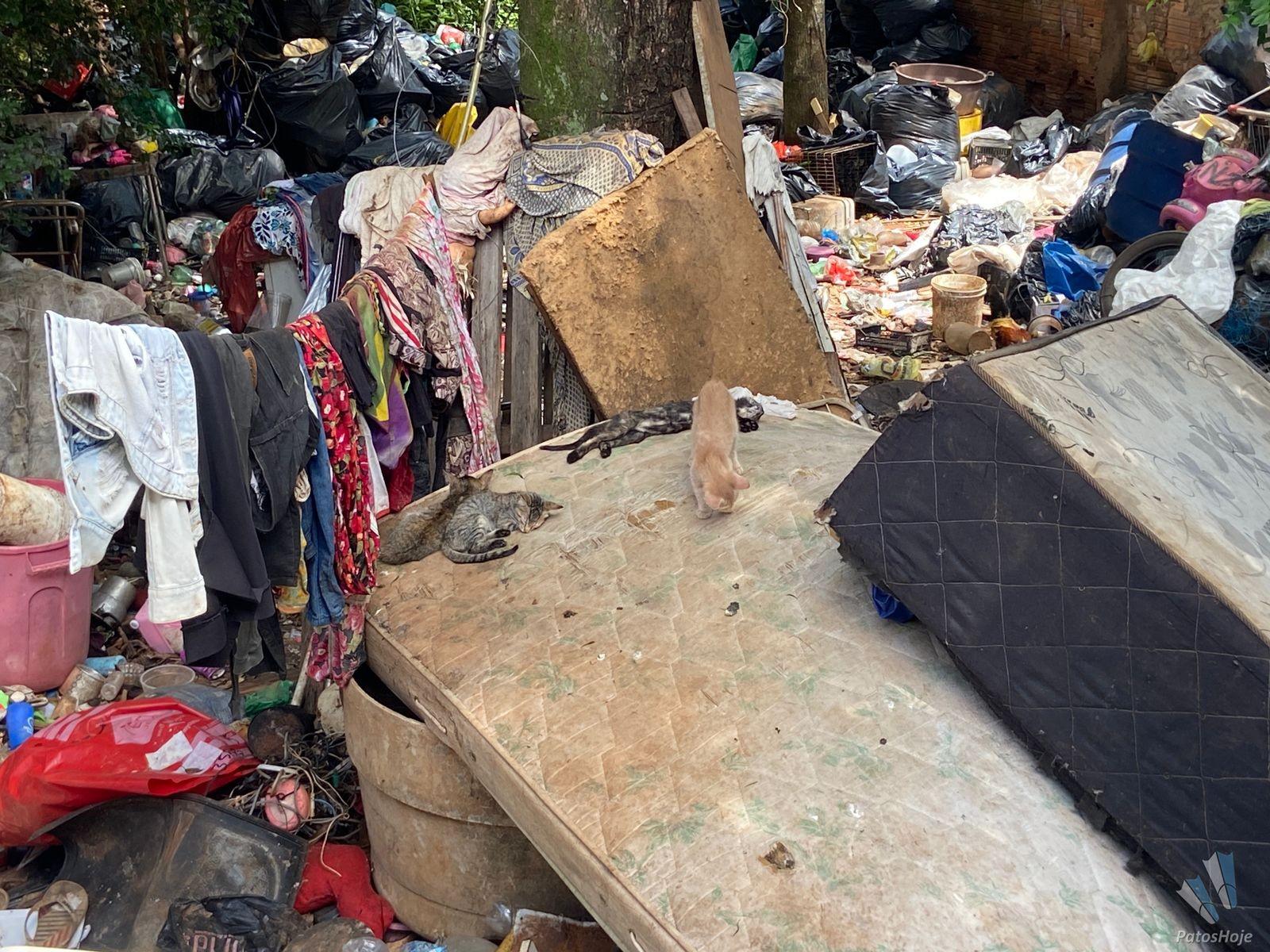 Os servidores encontraram cerca de 20 animais vivendo em meio aos entulhos, como cachorros, gatos e galinhas. Eles estão sendo resgatados pelo Centro de Controle de Zooneses e passarão por avaliação médica.