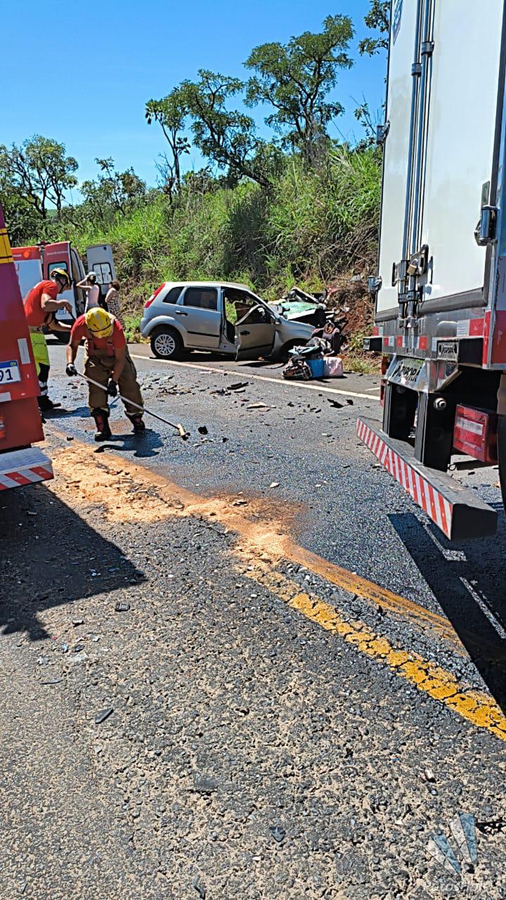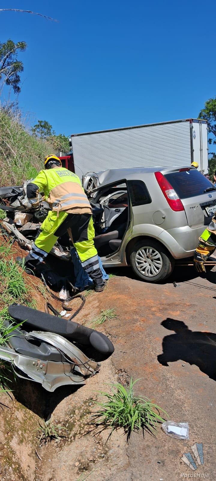 De acordo com o Corpo de Bombeiros, o caminhão transportava iogurtes de Pará de Minas para Patrocínio. Ao chegar ao local, as equipes constataram que o veículo de passeio, de placa NFZ-0218, permanecia sobre as quatro rodas, apresentando forte deformação na parte frontal e na lateral do lado do motorista. A condutora estava presa às ferragens.