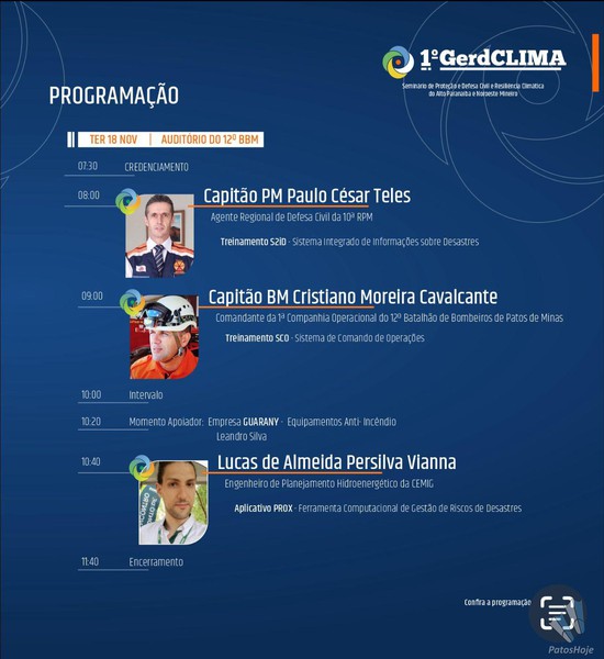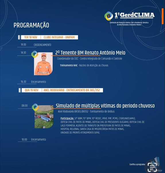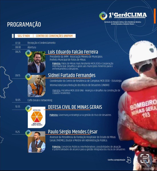 À tarde, o seminário traz painéis com Sidnei Furtado Fernandes, do Centro de Resiliência de Campinas (MCR2030/UNDRR); Adalberto Vieira de Souza, da Universidade Federal de Viçosa (UFV); e o Major BM Arthur Fábio Ferreira, especialista em políticas públicas e Subcomandante do 12º BBM , que discutirão as tendências climáticas, estratégias preventivas e de resposta a região do alto paranaíba e noroeste mineiro para o período chuvoso que se aproxima assim como uma reflexão sobre a importância da adesão aos municípios na Iniciativa da ONU MCR 2030.