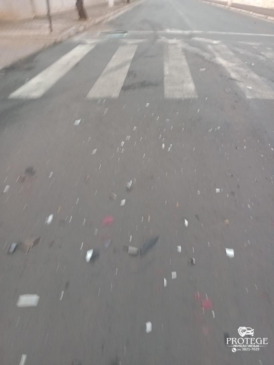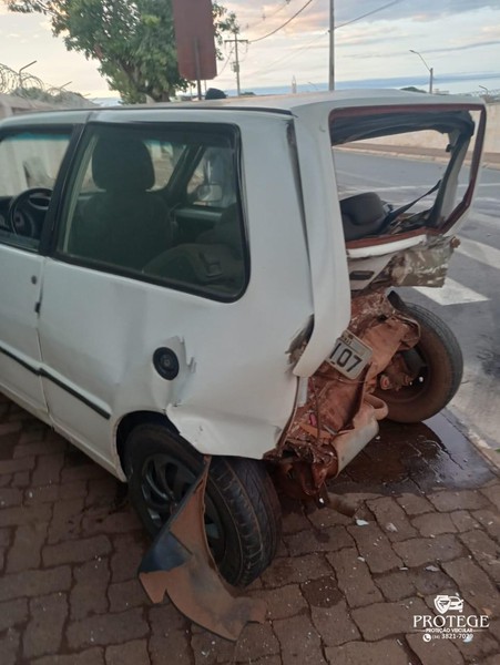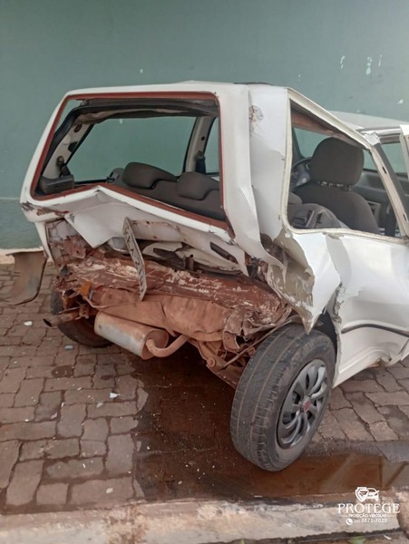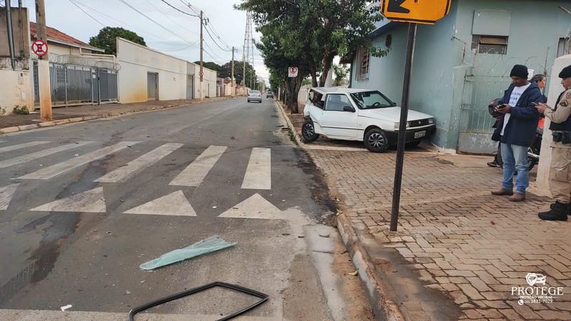 As imagens da câmera de segurança flagraram o momento da batida e o motorista em fuga pela rua Vereador João Pacheco. O impacto foi tão forte que arremessou o Fiat Uno para cima da calçada. O veículo ficou a parte traseira destruída. Por sorte, não havia ninguém no local e não houve feridos.